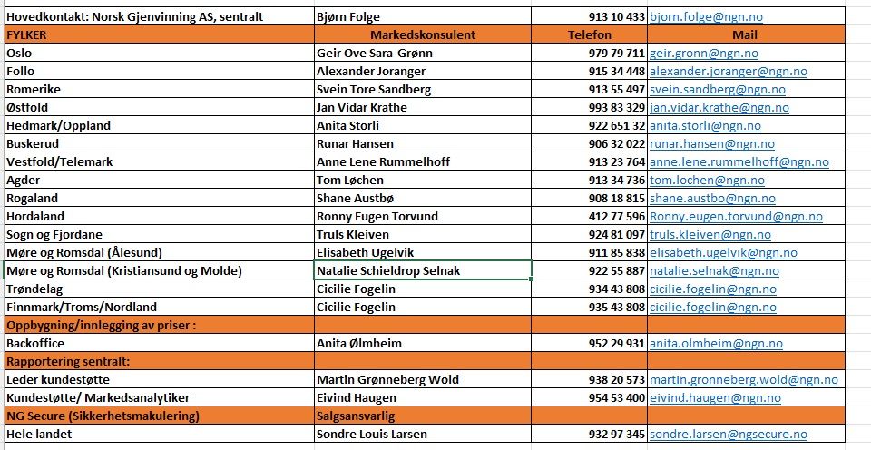 For å kobles til avtalen med Norsk Gjenvinning, må du som kunde henvise til avtalen med GAF og bestillingsnummer 400756 og under kan du se kontaktpersoner i ditt område!